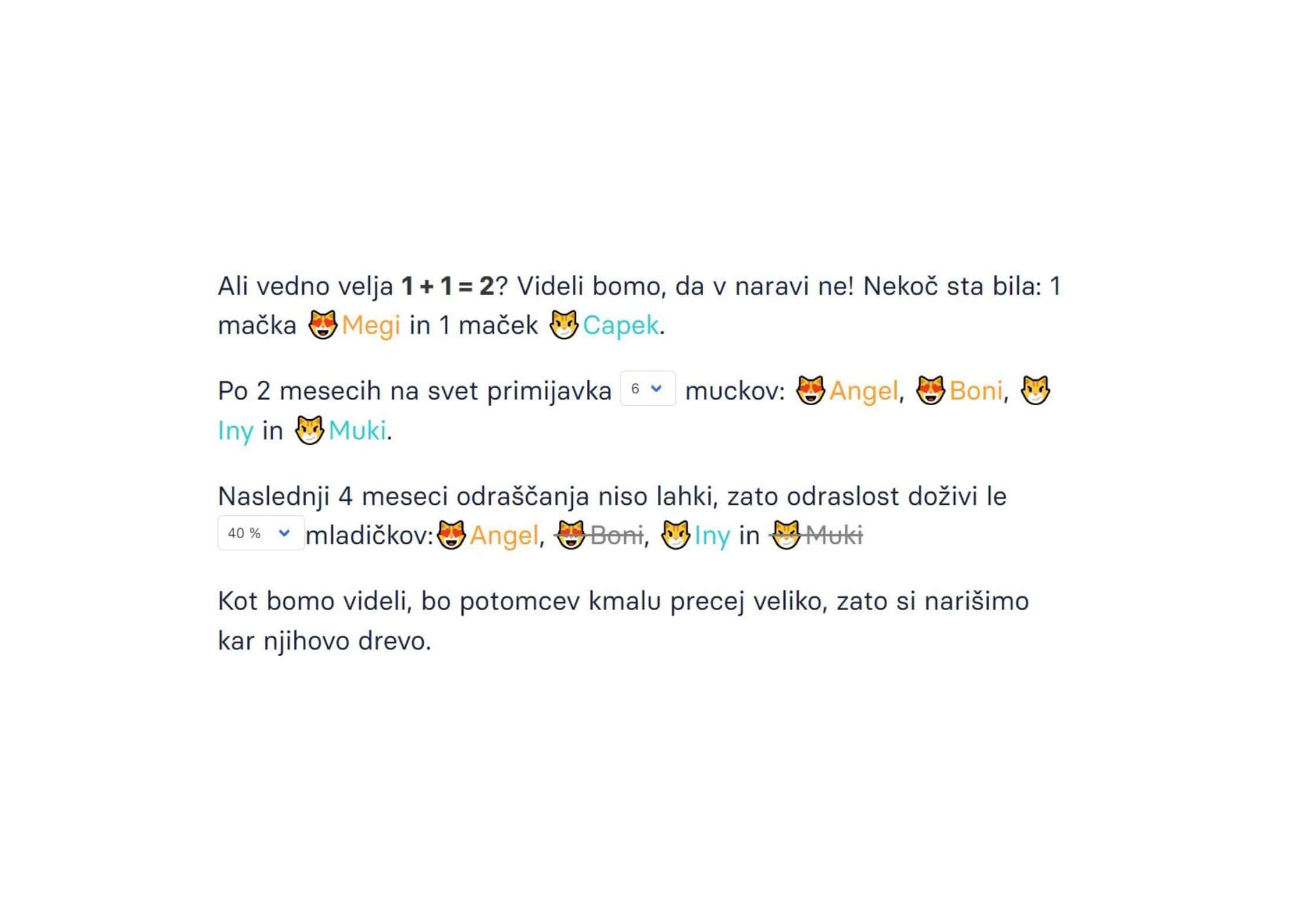 Kadar hišnih živali ne čuvamo dovolj in maček poje zlato ribico ali kanarčka, je račun 1+1=0. Če pa se srečata maček in mačka, lahko čez tri mesece pričakujemo do 5 ljubkih mladičev. In če se ta krog nadaljuje, ima lahko ta mačji par v petih letih več 100.000 potomcev. Te zanima kako? Poigraj se z mačjo matematiko.