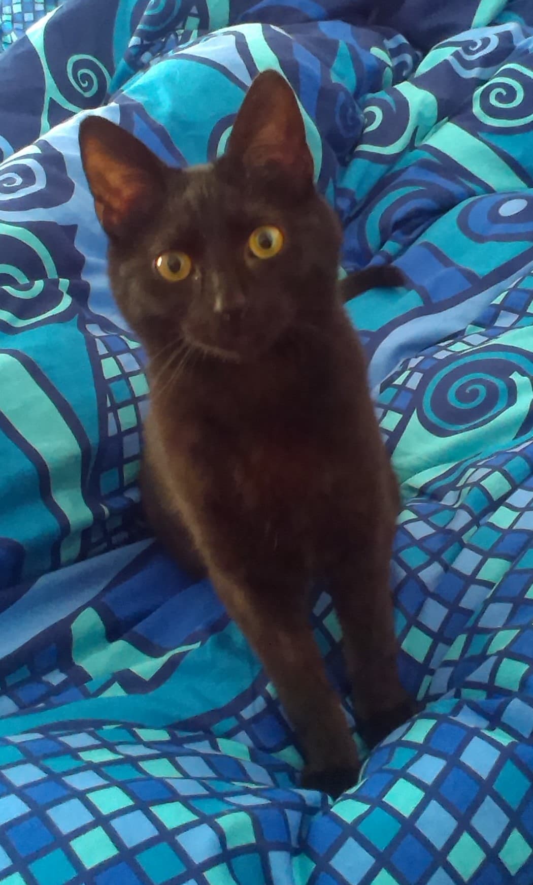 Za trenutek sem se vprašala, če bom sploh kos temu mačku, toda naslednji dan je bilo že vse OK (vsaj v primerjavi s prvim), takoj je obvladal stranišče, vedel je kje ima hrano in vodo, se odzival na ime... No, saj ne pravim, da je romantično miren muc, ki dneve spokojno prespi... Ravno obratno: zelo malo spi, je zelo zelo živ, poln energije, navihan, crkljiv, igriv, pogumen, firbčen...